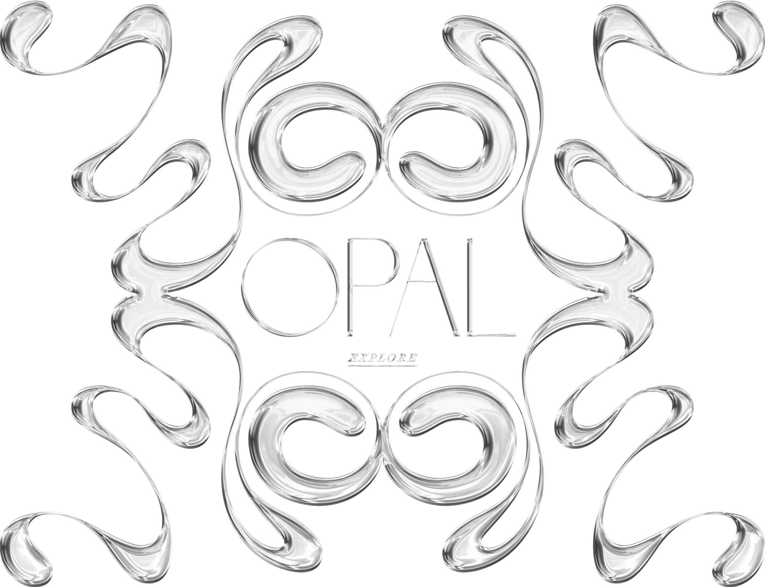 Silver metallic design with the words "OPAL" and "Explore" on a transparent background, surrounded by decorative swirling patterns.